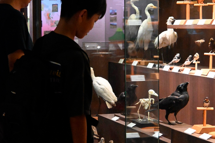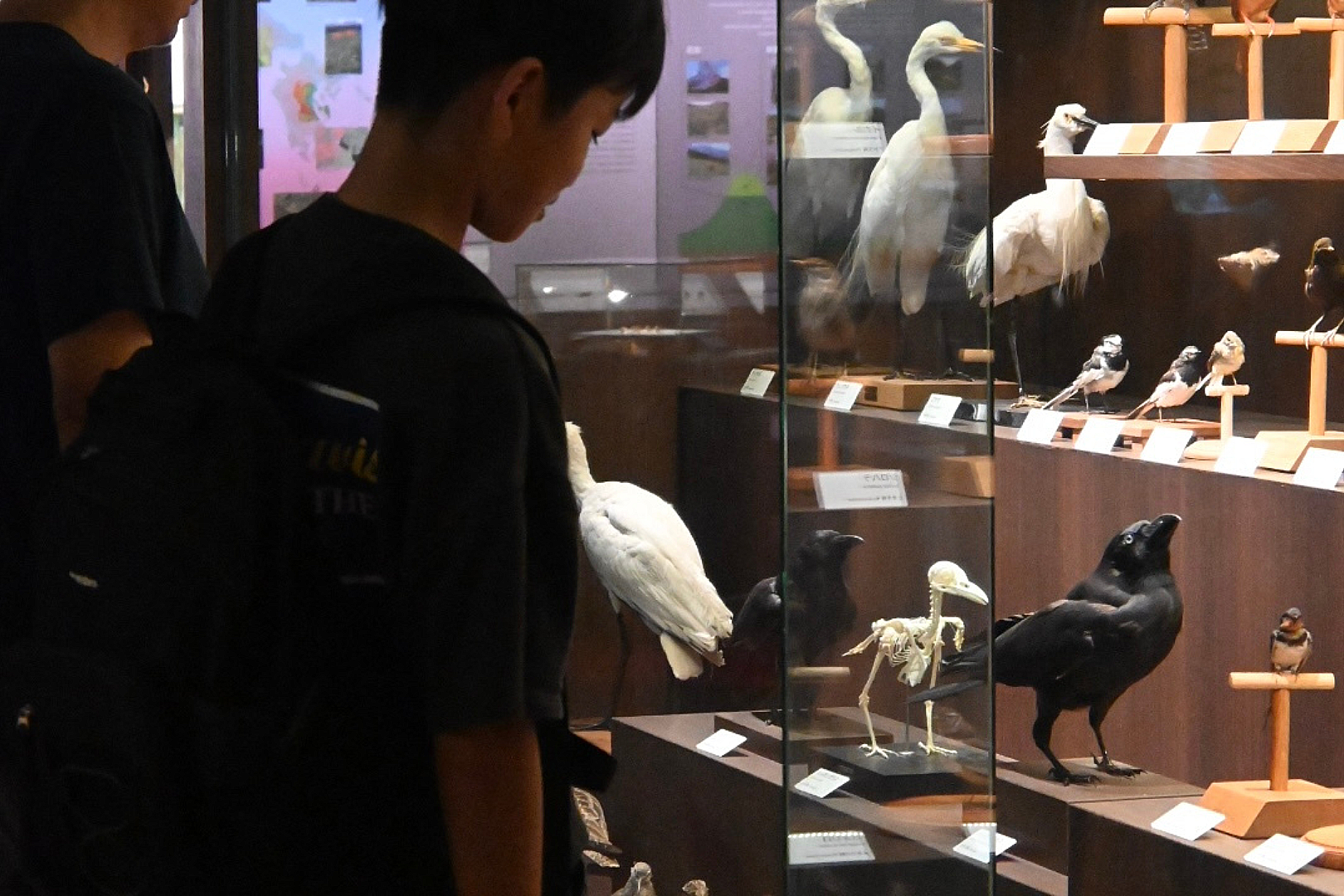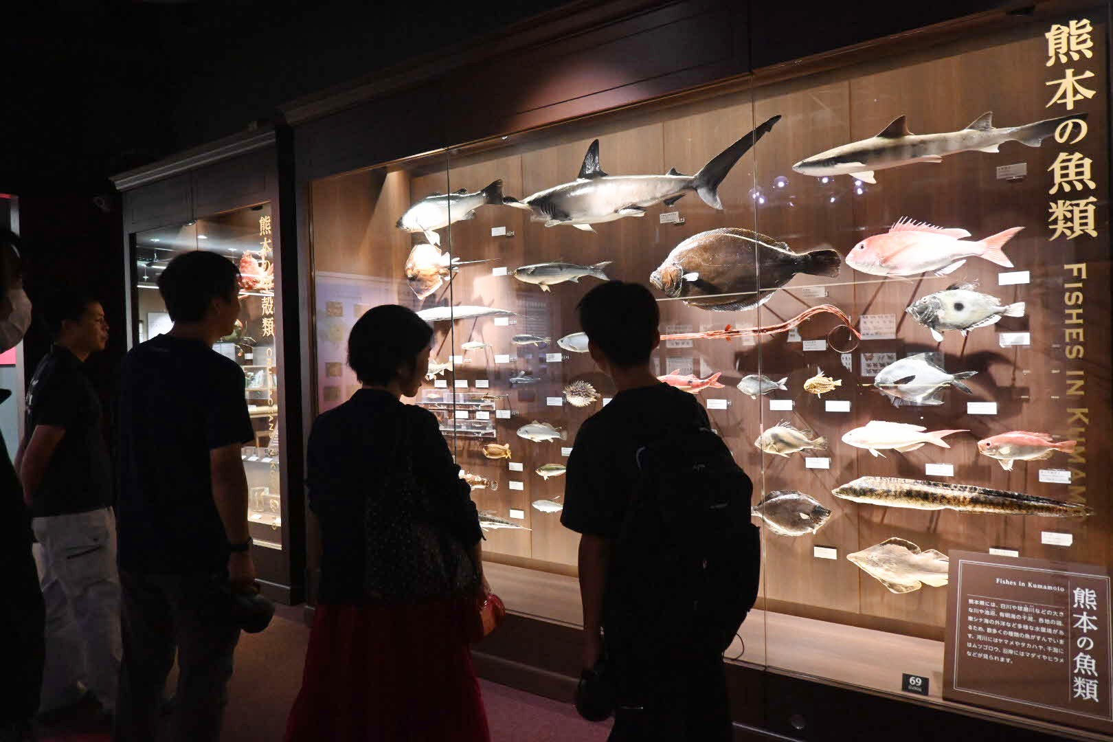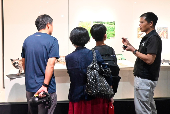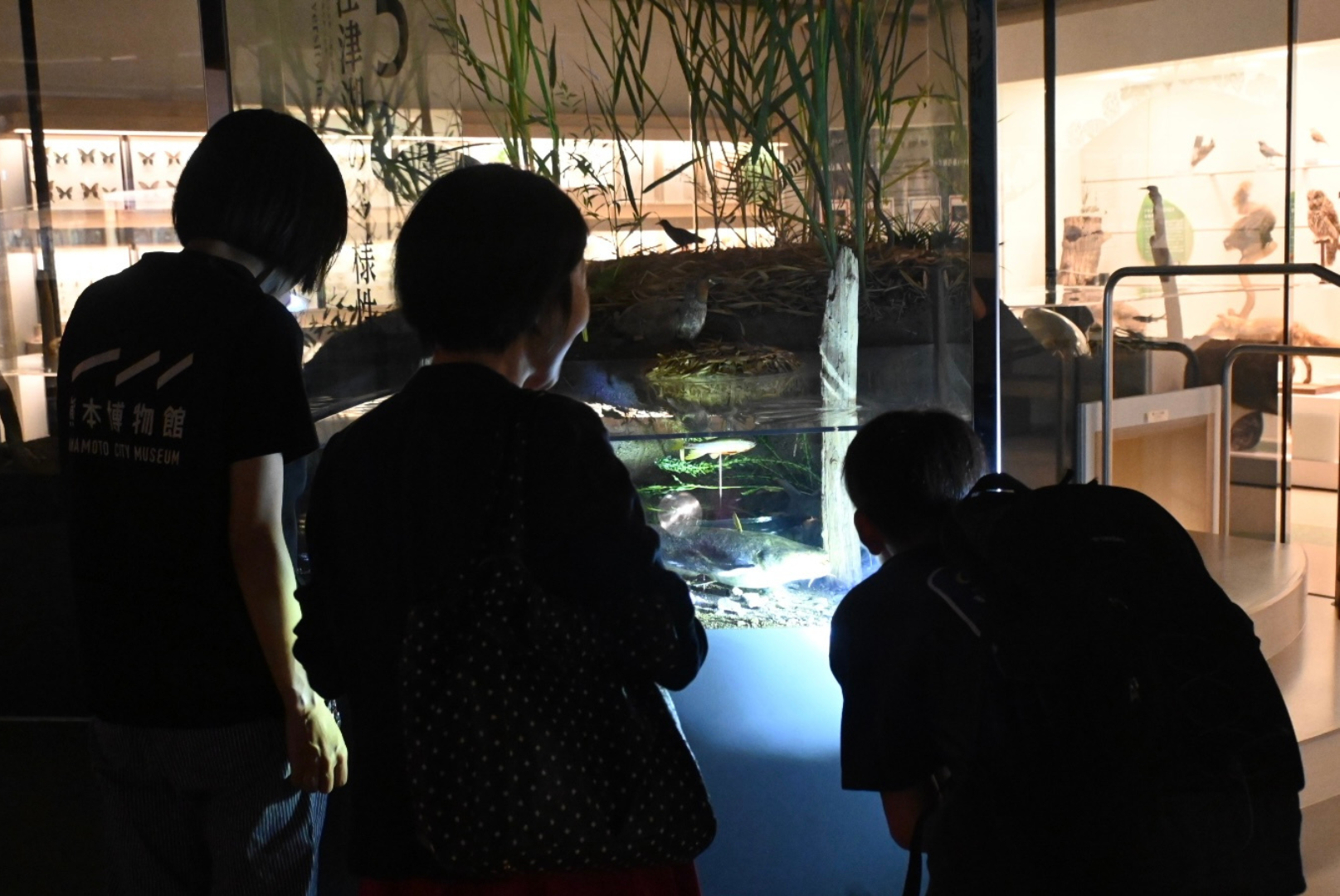 さらに、現在開催中の企画展「あなたのそばにエイリアン⁉―身近な外来生物―」の展示室では、熊本の身近にある外来種を中心に展示されており、「シロツメクサが外来種と知ってびっくりした」など、参加者が様々なリアクションを示していました。実際に企画展を手掛けた学芸員から直接話を聞くことができ、展示の構成に込められた意図や、パネルには載っていない裏話、展示準備の舞台裏など、普段は聞くことのできない貴重な情報に、参加者は熱心に耳を傾けていました。