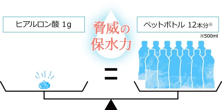 ヒアルロン酸は、強い粘度と弾力性を持つゼリー状の成分。肌にもヒアルロン酸は存在しており、ぷるぷるとしたクッションのような形状が肌の土台となっています。ヒアルロン酸が肌にプリッとした弾力を与え、ふっくらとした肌に見せてくれるのです。また、保湿力も高く、ヒアルロン酸1gに対して水分量はなんと6L!その脅威の保水力により肌の潤いをキープし、乾燥やハリの低下も防いでくれます。