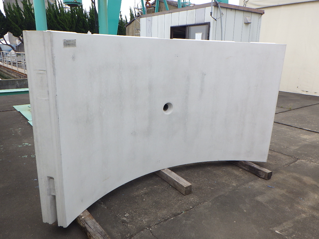 また、製品の実用化を見据えて、安藤ハザマ興業大井川工場にてCO2排出削減量を最大化した配合パターン(1)(CO2排出量:従来比75%削減)と、コストを従来と同等として低炭素化した配合パターン(2)(CO2排出量:従来比47%削減)の2つの配合(図1)でセグメントの試作品を製作し、製造性に問題が無いことを確認しました(写真1)。その後、試作品を屋外に暴露していますが、現在(注3)までひび割れなどの不具合も発生していません(写真2)。