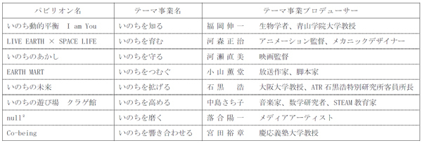 パビリオン名及びテーマ事業名、テーマ事業プロデューサー(8名)