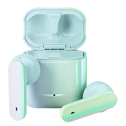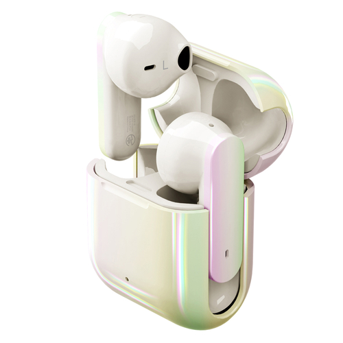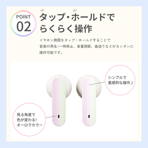 オーロラ加工を施した煌びやかなデザインの完全ワイヤレス ステレオイヤホン インナーイヤータイプです。省電力、高速通信のBluetooth® 5.3を搭載しています。イヤホン本体は簡単に着脱でき、密着する違和感や長時間での疲労感を感じにくいインナーイヤータイプです。充電ケースは高さ39mmのコンパクトサイズで、イヤホン本体を収納しても約25gと軽く、持ち運びにも邪魔になりません。充電ケースはイヤホン本体を約2回フル充電できます。