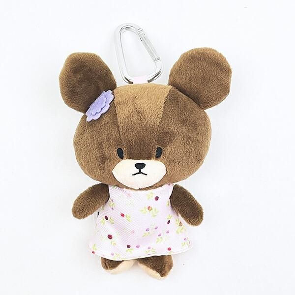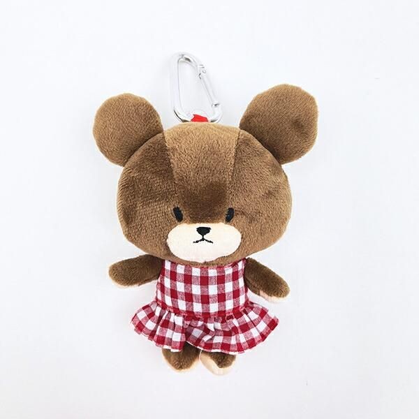 まずはガーリーな赤いギンガムチェックのワンピースを着た、 **ぬいぐるみエコバッグ レッド**のジャッキーから紹介します。カラビナつきで、バッグへの付け外しがラクに出来る仕様が嬉しい。