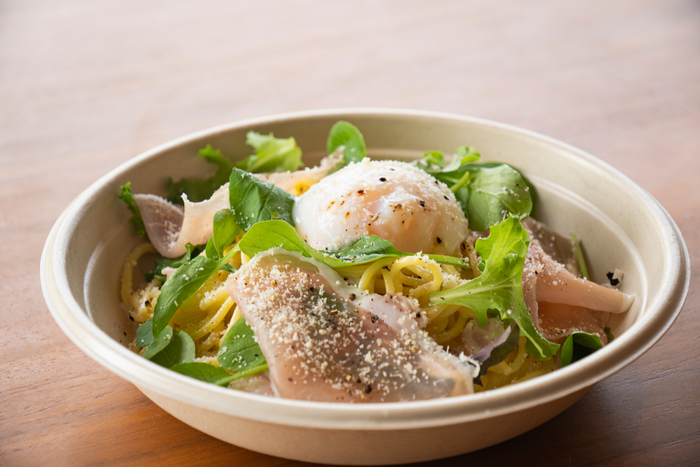 温泉卵と生ハムの贅沢な組み合わせが、濃厚なカルボナーラと絶妙に調和!冷製ならではの軽やかな味わいで、夏の暑さに負けない一品です。ふんわりとした温泉卵がパスタに絡みつき、食欲をそそります。