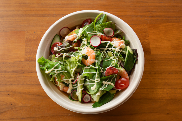 エビや新鮮なお野菜がたっぷりと盛り付けられた、見た目にも美しいサラダうどん。シャキシャキとした野菜の食感が楽しい一品で、栄養満点でヘルシーなうどん料理です。夏の暑さを吹き飛ばすさっぱりとした味わいが食欲をそそります。