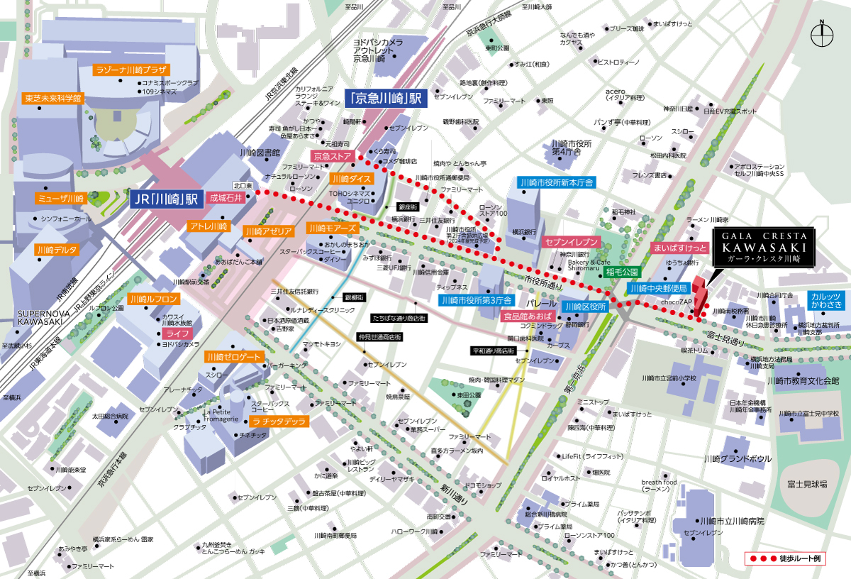 相次ぐ再開発により進化を遂げてきた「川崎」駅周辺では、「ラゾーナ川崎プラザ」や「ミューザ川崎」、「ラ チッタデッラ」といった大型商業施設が林立し、快適な住み心地を形成する住環境が整っています。加えて、マンションの周辺には多彩な商業施設が揃うほか、中央郵便局や休日急患診療所、市役所といった公共施設が徒歩2~4分圏内にあるなど、中枢エリアならではの安心で便利な暮らしを享受できます。