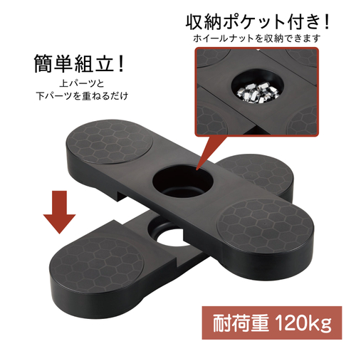 上パーツと下パーツを重ねるだけの簡単組立。中央にはホイールナットを収納できるポケット付き!