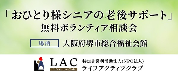 特定非営利活動法人(NPO法人)ライフアクティブクラブ(所在地:大阪府堺市、理事長:竹内信美)は、堺市総合福祉会館にて、「おひとり様シニア」を対象とした無料老後相談会(ボランティア)を開催することを決定しました。