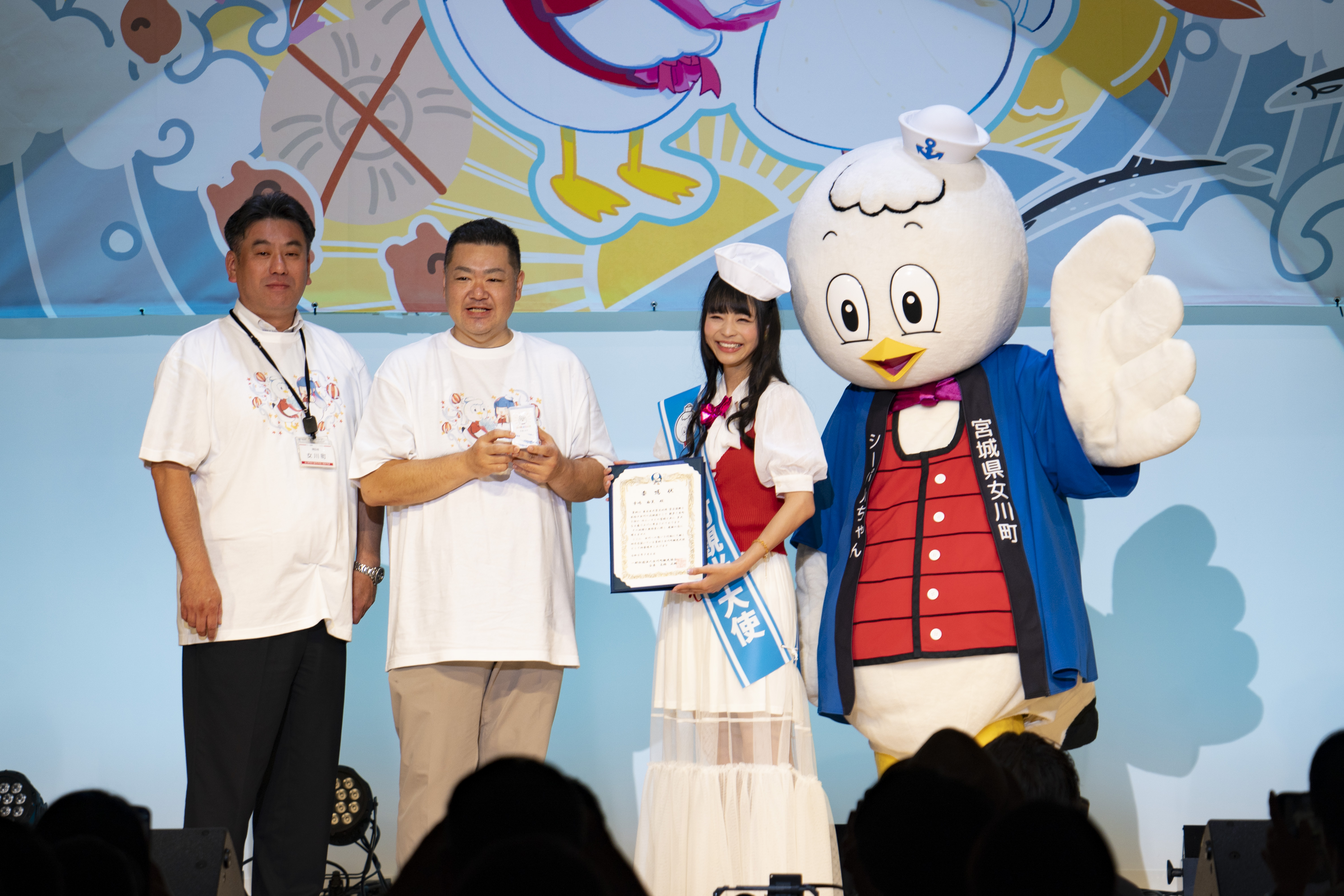 アンコールでは、シーパルちゃんだけではなく、なんと女川町町長の須田善明と女川町観光協会会長/蒲鉾本舗髙政の高橋正樹が登場し、寺嶋の女川町観光大使就任をサプライズ発表。ファン歴12年という“古参”の町長から「ぜひこれからの女川を一緒に盛り上げていきましょう」と期待の込められたメッセージとタスキが贈られ、会場はどよめきと共に、大きな拍手に包まれた。