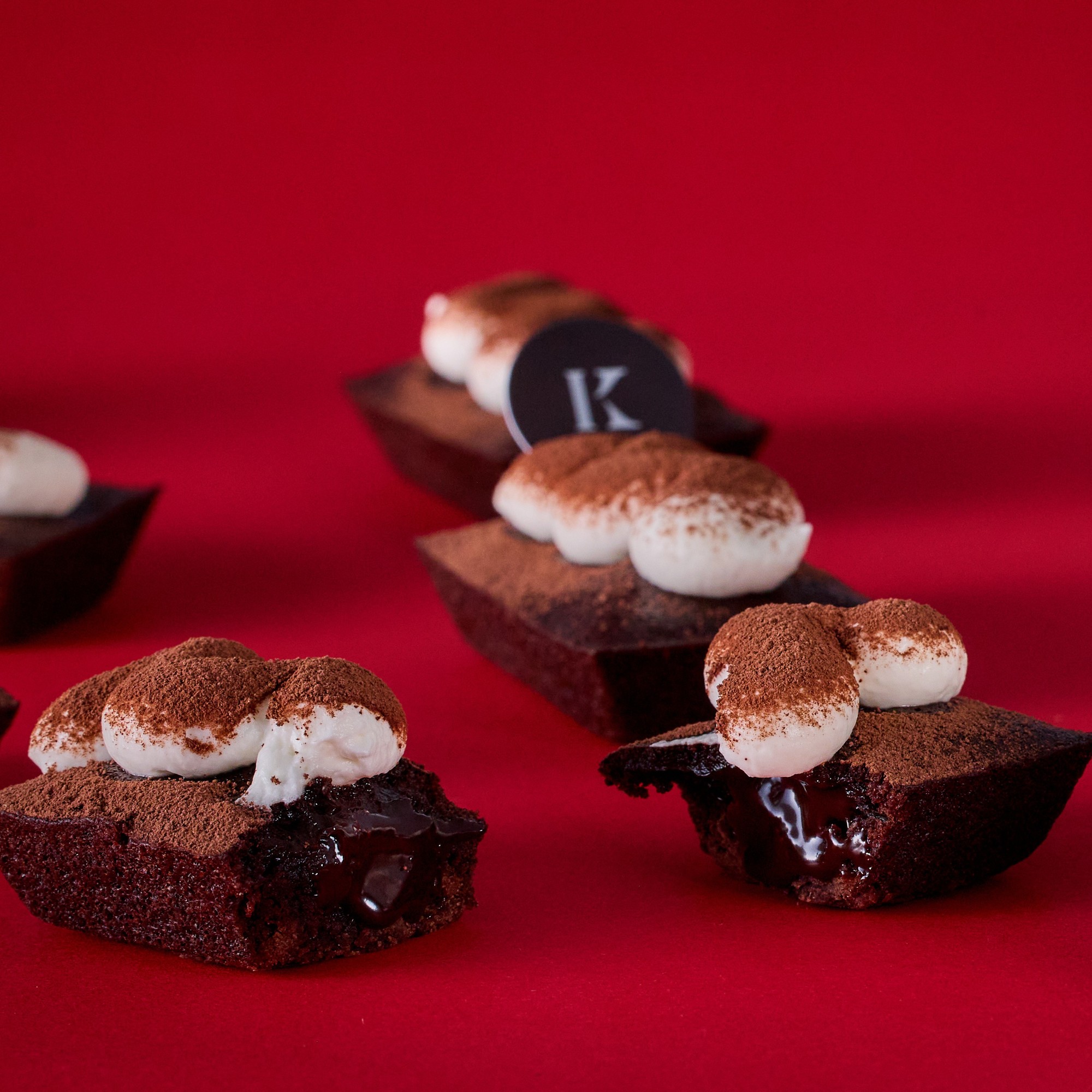 芳醇な発酵バターの香りが風味豊かに広がる焼きたてショコラフィナンシェのサクッとした食感は出来立てならでは。ふんわり生クリームと、中に閉じ込めたガナッシュチョコレートのとろっとした食感と濃厚で香高いチョコレートの味わい、“サクッ、ふわっ、とろっ”と異なる食感をお楽しみいただけます。