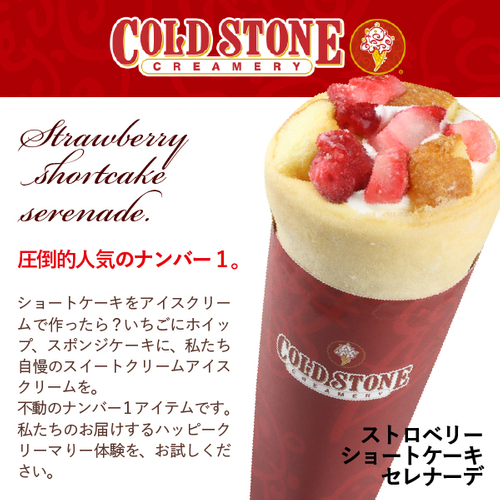 1食目。ストロベリー・ショートケーキ・セレナーデ。ロマンチックな名前をもつこのクリエーションは不動の人気ナンバー1。もちもちしたクレープの端っこまでぎっしりアイスクリームが詰まっているので、お店で普通サイズ(like it(S)サイズかlove it(M)サイズ)を食べるよりボリュームがありました。お手頃サイズ、、というよりは、しっかり食べられる量、アメリカンなコールドストーンを感じられる量です。