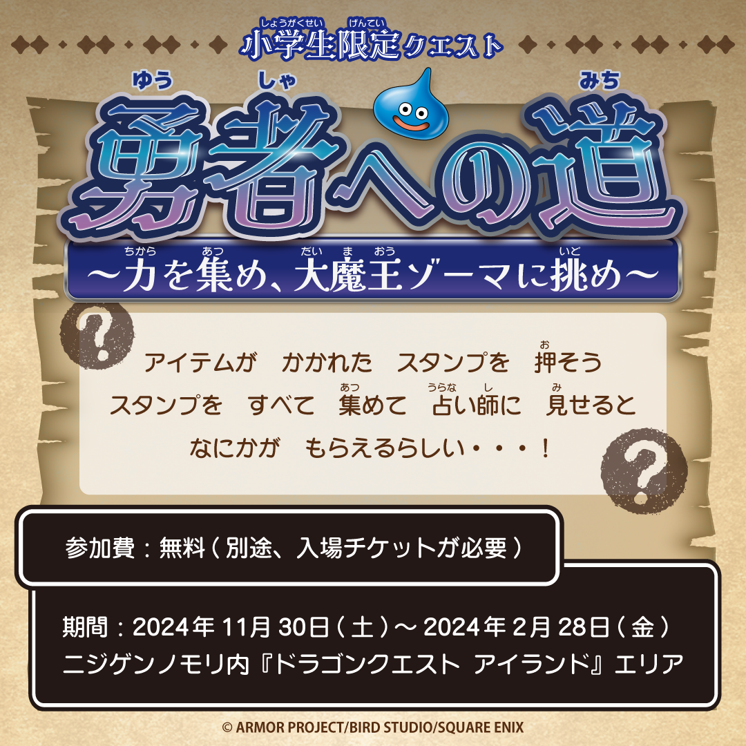 兵庫県立淡路島公園アニメパーク「ニジゲンノモリ」内にある人気アトラクション「ドラゴンクエスト アイランド 大魔王ゾーマとはじまりの島」では、2024年11月30日(土)から2025年2月28日(金)までの期間限定で、小学生限定クエスト「勇者への道 ~力を集め、大魔王ゾーマに挑め~」を開催いたします。