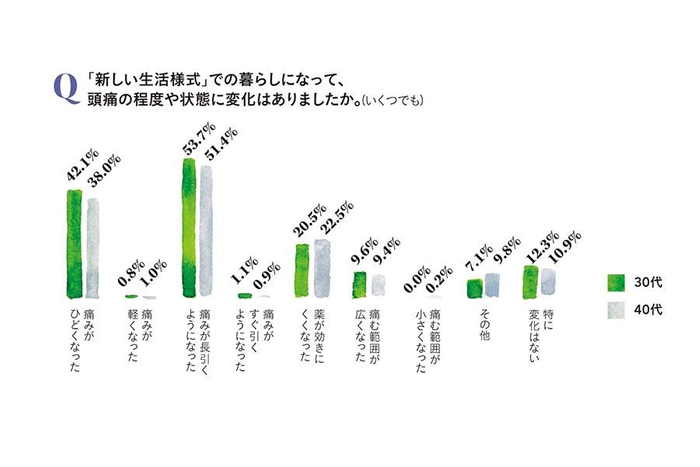 このようなストレスとつながっていると思う体調不良として、「疲れやすい」「体がだるい」といった“全身の倦怠感”の次に多く挙がったのが「頭痛」でした。「頭痛」は30・40代共に、40%以上の人が新しい生活様式下で感じる不調とのこと。このうち、「以前より頭痛が増えた」と感じている人は両世代とも90%程度、また、「以前より頭痛の程度が悪化した(痛みがひどくなった、長引くようになった、など)」人も40~50%ほど存在しました。