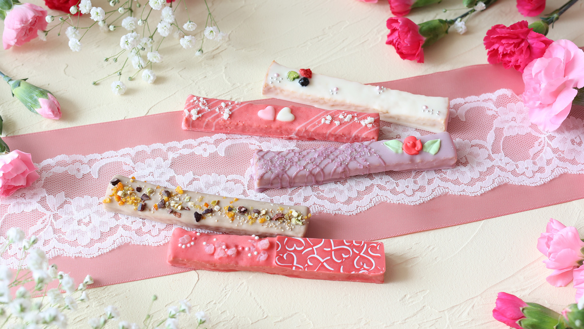 限定品は、5本入と10本入の2種類。バラやハートのモチーフを中心に、可愛らしいトッピングを使用しています。母の日を祝う華やかなデザインです。