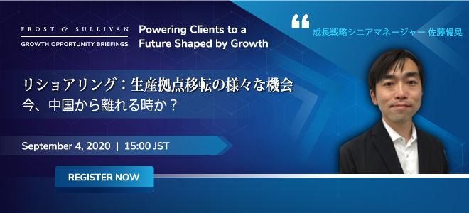フロスト・アンド・サリバンは、成長戦略シニアマネージャーの佐藤暢晃によるウェビナー、「リショアリング:生産拠点移転の様々な機会」へ皆様をご招待します。この機会にぜひエキスパートの洞察、行動に移せる戦略をお持ち帰りください。