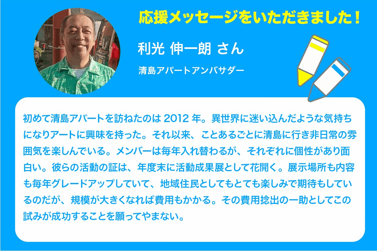 日常の延長線上に営まれる清島のアート文化は、地域と結びつき、表現の種を育ててきました。未来の誰かがこの場所の空気を感じ、ここで生まれた物語に触れられる事を願っています。