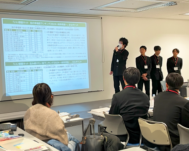 昼食後も引き続きグループワークが行われ、データ可視化ツールを駆使した分析結果をまとめ上げていきました。午後からは各チームが順に発表を行い、「住み続けられる街」をテーマに、データから導き出した地域の未来図を提示。教員陣からの質問やアドバイスを受け、活発な議論が展開されました。