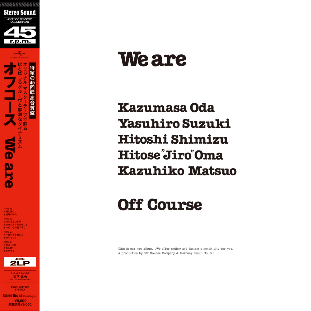 『We are』、『over』、今回、ステレオサウンドが発売するこの歴史に深く刻まれる2作品は、東京・湯島で「PICCOLO AUDIO WORKS」を主宰する名エンジニア松下真也が、オフコース作品への深い想いを持って、アルバム初となる45回転盤アナログレコードと、同じく初となるSACDハイブリッド盤に仕上げました。5人時代のオフコースが、精魂込めた音の端々までを存分に味わい尽くしてください。