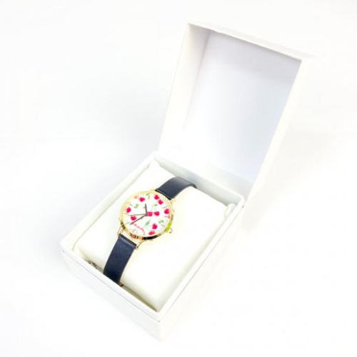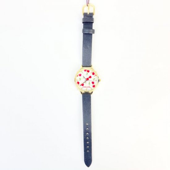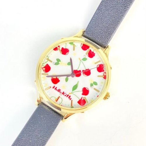 ブラックのベルトにゴールドのフレーム、そして文字盤にはキティちゃんの形のさくらんぼがデザインされた腕時計です。