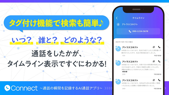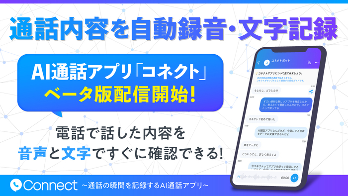 「コネクト」は、通話内容を自動録音、文字起こし(文字記録)し、データ化するAI通話アプリです。「通話内容を忘れてしまった」「メモを取り忘れた」といった場合でも「コネクト」で通話内容を聞き直すことができ、あらゆる電話シーンをサポートいたします。現在、GooglePlay版についてはリリース前テストを行っているため、後日配信を予定しております。