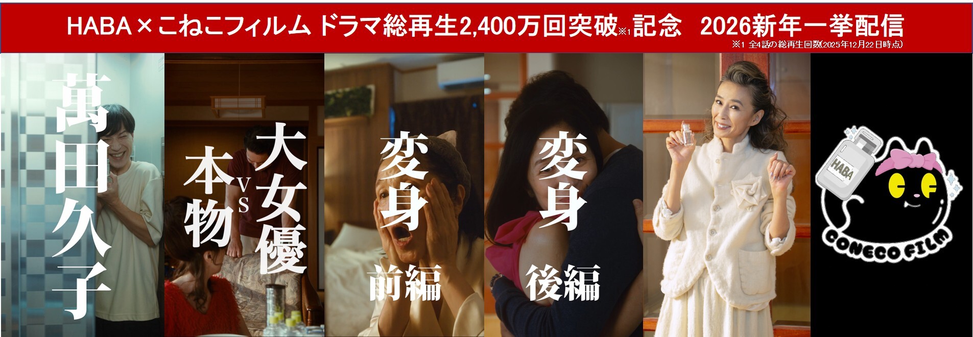 社名の由来でもある『Health Aid Beauty Aid=美と健康を助ける(HABA)』を展開する株式会社ハーバー研究所(所在地:東京都千代田区)は、総フォロワー数500万人超え(2025年12月21日時点)!新たな価値を創造し続ける唯一無二の大人気クリエイター集団「こねこフィルム」とコラボレーションし、縦型ショートドラマ4本を制作。2025年9月よりTikTok、Instagram、YouTube等にて第1弾から第4弾を順次公開しました。その全4話のドラマ総再生回数2,400万回突破※1を記念して、新年2026年1月2日(金)よりYouTubeにて、一挙配信をいたします。