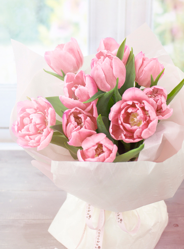 淡いピンクチューリップをメインにピンク、白などの小花を合わせても可憐で優しい印象に仕上がります。他にも違う花と組み合わせることも可能ですので、ぜひスタッフまでご相談ください。