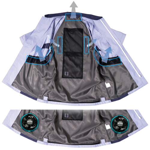 表地と裏地の間を通って脇、後ろ首筋など必要で最適な場所から風が抜けます。特に女性は胸や脇辺りに汗をかきやすいので脇から袖に抜ける風が快適です。抗菌防臭加工の裏地で気になる臭いも安心です。