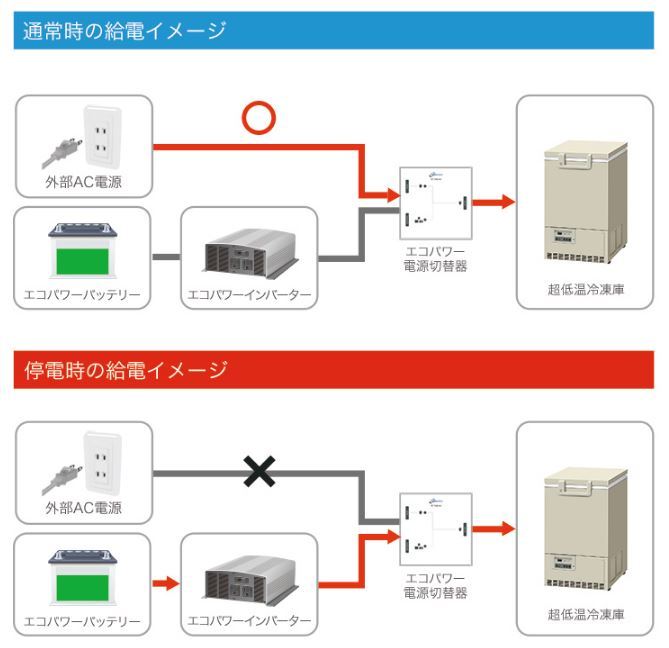 オンリースタイルでは、既存の商品エコパワーシリーズに加えて、ワクチン保管用フリーザーのバックアップ電源用途のお客様に向けて、突入電流に対応した専用の商品を用意し、厚生労働省が指定する4機種に対応を可能とした。万が一停電が発生した場合でも標準の構成で約6時間のバックアップを可能としている。