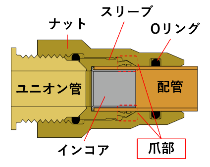 新たに開発した「フレアレスジョイント」はナット、スリーブ、インコア、Oリングの4つの部品で構成されます。締め込むとインコア部が押され、スリーブの爪部が配管に食い込むことでメタルシールされ気密性能を発揮します。これにより一度締め付けると配管が抜けにくい構造を実現しています。さらに、2つのOリングで水の侵入を防止すると共に、冷媒漏れも防ぎます。