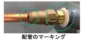 「フレアレスジョイント」の施工は、マーキングゲージを用いて「接続部とジョイントの位置をマーキング」「レンチで1周回す」という一定の施工方法を採用しています。また施工後の仕上がりはマーキングにて第三者が目視で確認可能です。これにより作業ミスや品質のばらつきが起きにくく、施工品質を安定化させることができます。