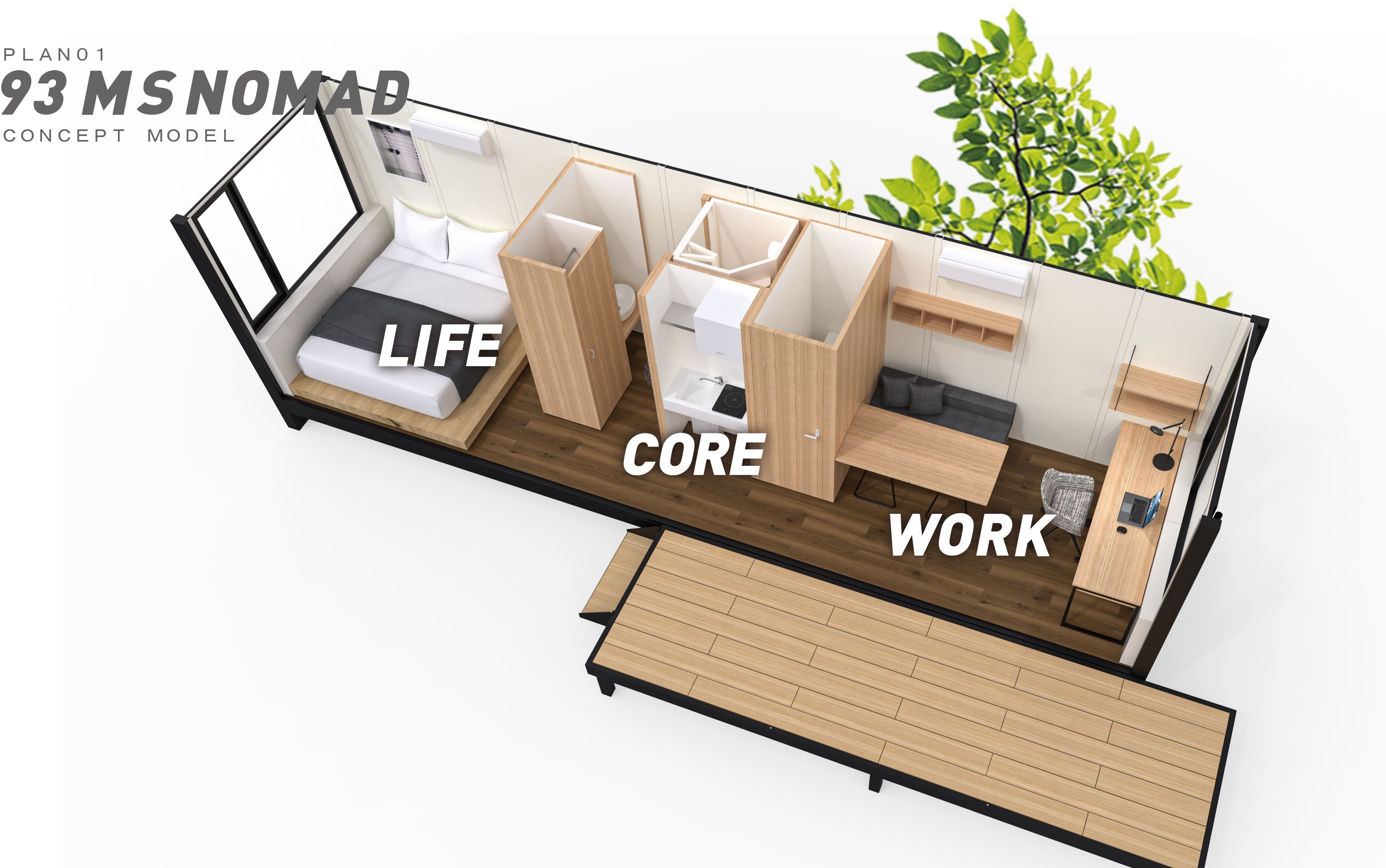 「自由に働き、自由に暮らす」というワーク・ライフスタイルの提供を開発目的とし、設置・移設の容易なユニットハウスをベースとしたMS NOMADを開発しました。