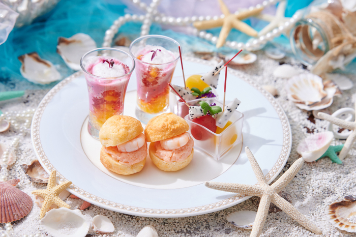 真珠貝をイメージしたピンク色のトゥンカロン、鮮やかな珊瑚がのったオーシャンブルーのグレープフルーツゼリー、人魚姫のカップケーキなど、人魚の棲む海中の世界をモチーフにしたスイーツに加え、海の幸とサマーフルーツを贅沢に使用した軽食もご用意。夏でもさっぱりとお召し上がりいただけるアフタヌーンティーです。都心にありながら緑に囲まれた“都会のオアシス”で、贅沢なひとときをお過ごしいただけます。