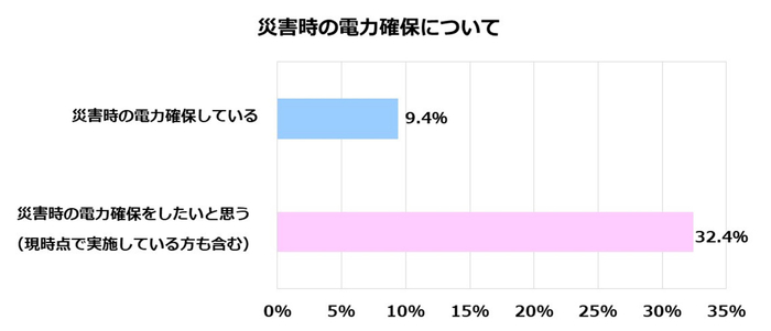 自宅で行いたい防災対策について聞いたところ、32.4%、およそ3人に1人が「災害時の電力確保」と回答しました。しかし実際に「災害時の電力確保」を行っている人は9.4%、およそ10人に1人に過ぎませんでした。