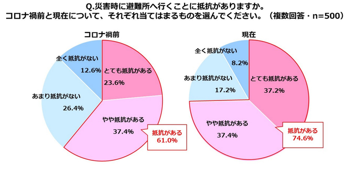 新型コロナウイルス感染症の拡大に伴い、「在宅避難」という言葉を耳にする機会が増えたのではないでしょうか。災害時に避難所に行くことへの抵抗感を聞いたところ、コロナ禍前の時点で、61.0%の方が抵抗を感じていたことがわかりました。コロナ禍の現在においては、抵抗を感じる人が13.6ポイント増え、74.6%の方が抵抗を感じると回答しました。