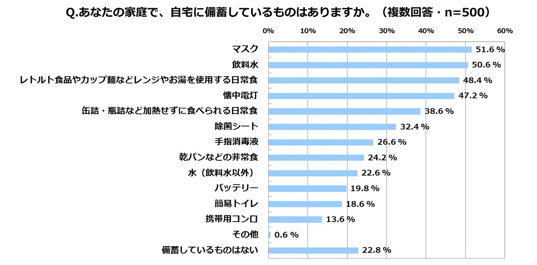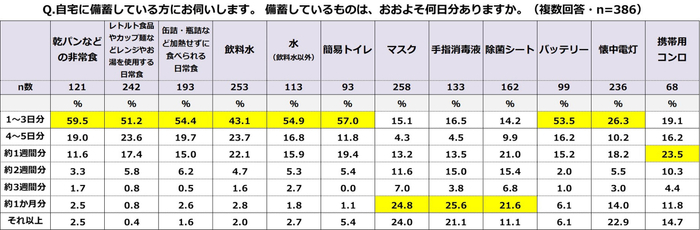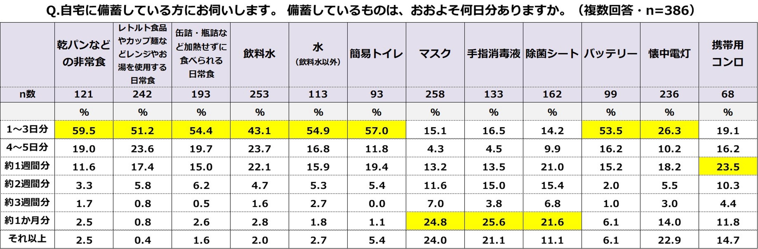 コロナ禍で「衛生用品」の備蓄は十分な一方、その他の防災備蓄は1~3日分のみの用意が過半数