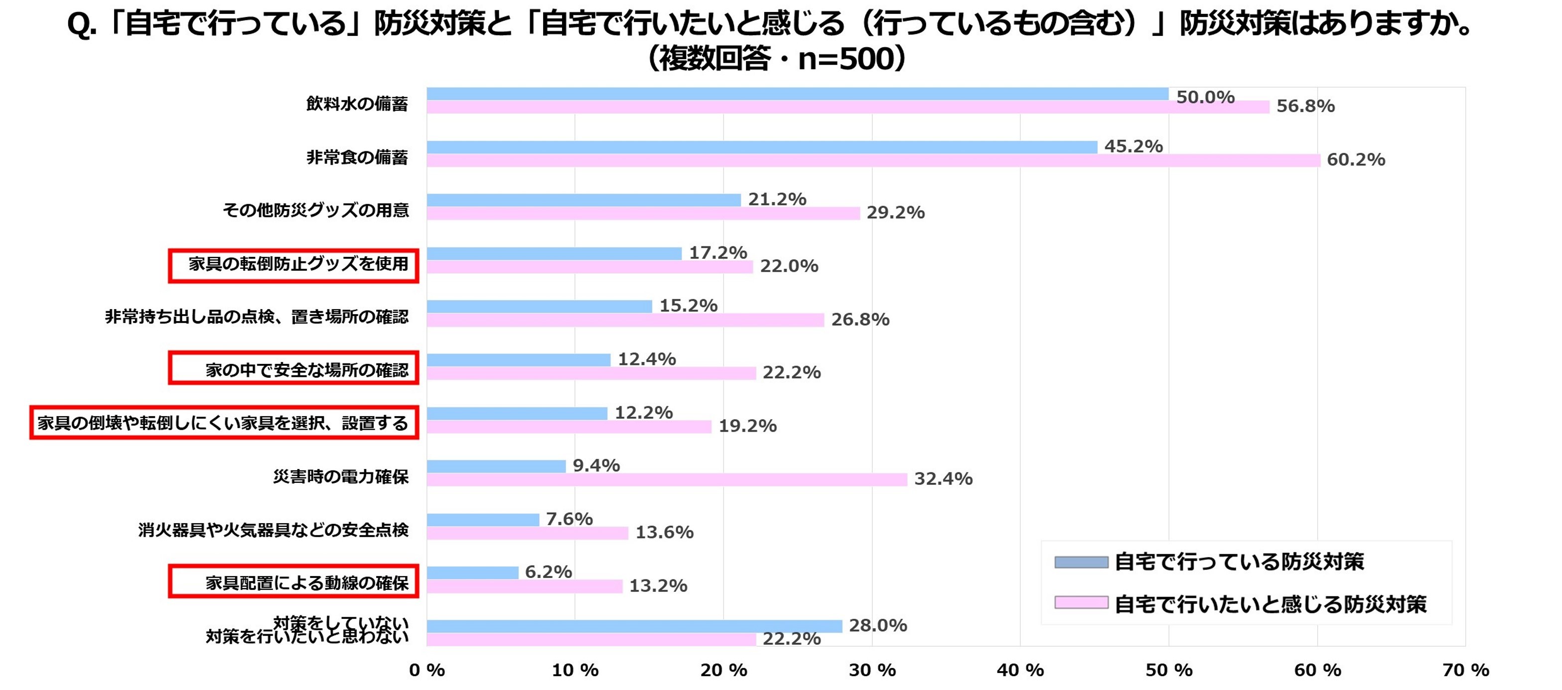 なお、「避難所にいくことに抵抗がある」と回答した人のうち、約5人に1人が「自宅でも安全だと思っているから」ということがわかりました。そこで、自宅で行っている防災対策について結果をみると、「家具の転倒防止グッズの使用」や「家具の倒壊や転倒しにくい家具を選択」「動線確保」などの命を守るために重要な自宅の安全確保に該当する項目を行っている人が少ない結果となりました。