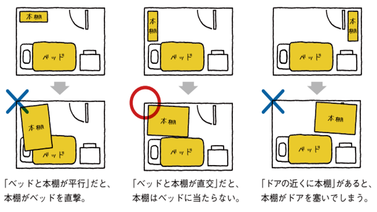 地震時のケガの要因の4割以上は家の中の家具の転倒や物の散乱によるものです。家の中を整理して、転倒物や落下物を少なくすることが大切です。いらない物を減らすことも立派な地震対策です。また、地震の揺れが収まったあと、安全に外へ出られるルートを確保していますか。寝室の入口にあるタンスや本棚が倒れてドアが開かなくなるケースもあります。部屋から外へ出るルートを想定した家具の配置を心がけましょう。図のように家具が倒れてこない位置にベッドや布団を置きましょう。