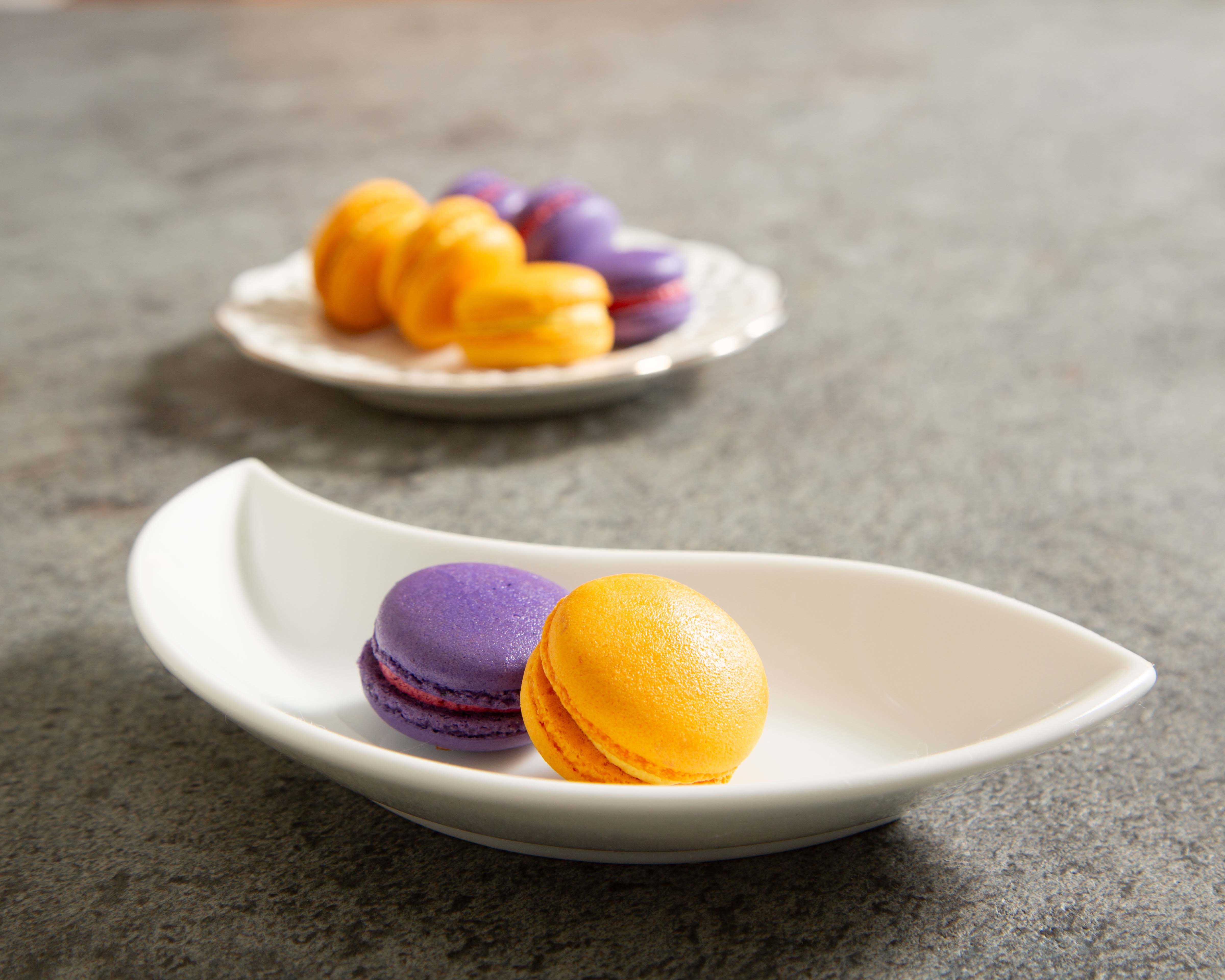2023年9月15日(金)~10月31日(火)までのハロウィンフェア開催期間中、WEBにてご予約いただいたお客さまには、ハロウィンカラー(2色)で仕上げた自家製のマカロンを各色1つずつプレゼントさせていただきます。しっとりと焼き上げた上品な味わいのマカロンは、爽やかなベルガモットと酸味が魅力のカシスで仕上げました。そのままはもちろんのこと、お気に入りのスイーツにトッピングしてお楽しみください。