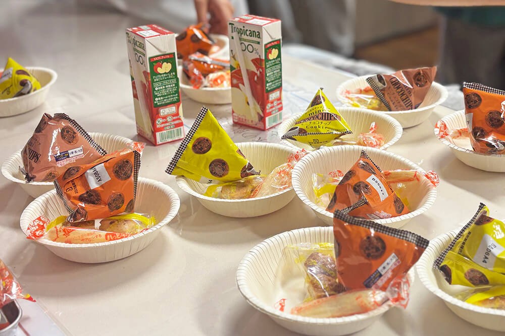 「スナック交流タイム」では、おやつを囲んで先生・スタッフ・参加者同士が自由に交流。英語だけで会話する EOP(English Only Policy)ミッションにも多数が挑戦していました。