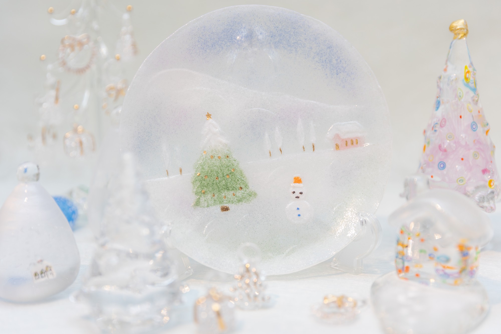 展示には、日本各地で活躍するガラス作家23名の一点ものが集結。グラスやプレートなど日常に寄り添う器から、ツリーやサンタのオブジェまで、ホリデーシーズンを彩るアイテムが並びます。すべての作品は実際にご購入いただけます。暮らしをブライトアップするインテリアとして、また特別な贈り物としても最適です。