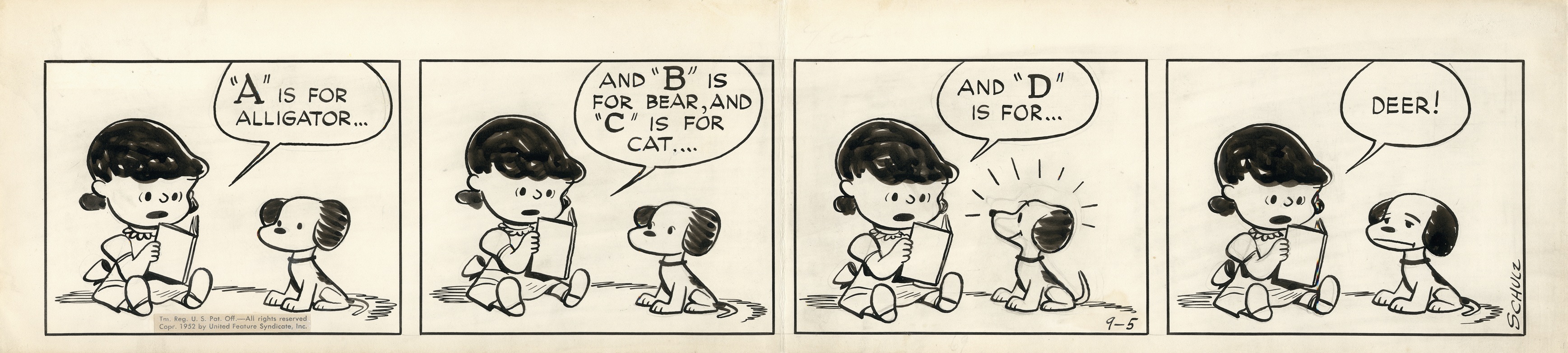 AはALLIGATOR(ワニ)、BはBEAR(熊)と、AからZのアルファベットで始まる動物を読み上げるルーシーとスヌーピー。DはDOG(犬)だと期待しますが…。