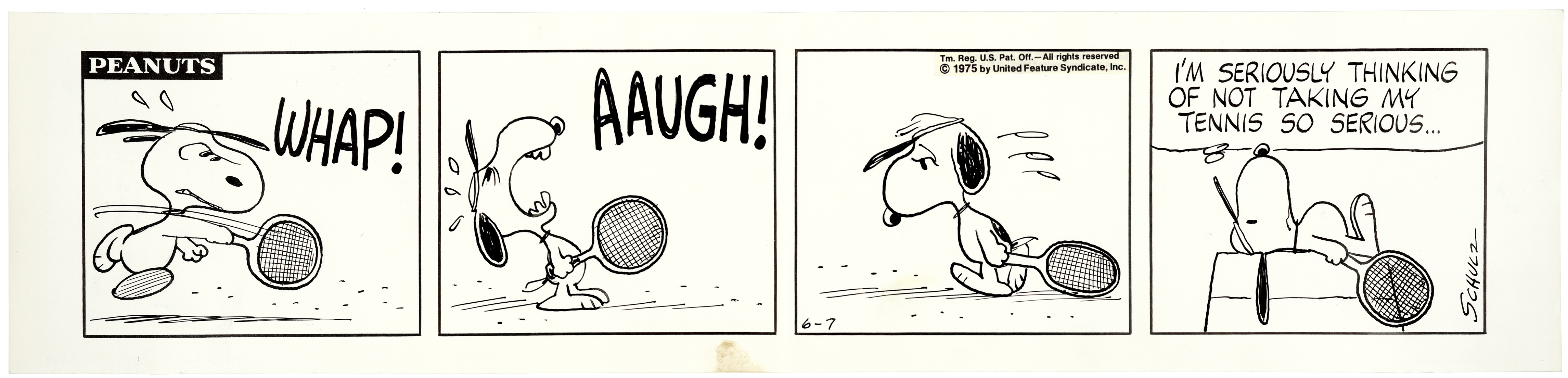 真剣にテニスに取り組むスヌーピー。テニスとなるとどうしても感情が剥き出しになってしまいます。
