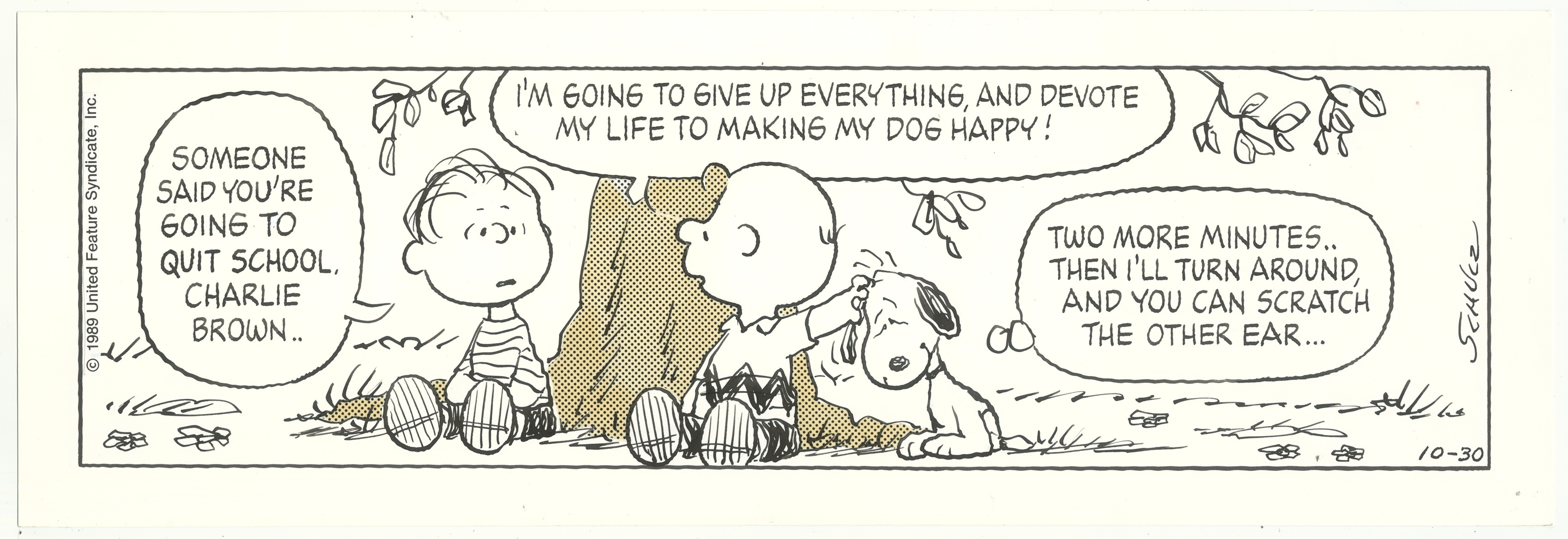 学校をやめて犬を幸せにするために人生を捧げようと決意するチャーリー・ブラウン。しかし、スヌーピーはそんな気持ちも知らず、かゆい耳を思うがままにかいてもらうのです。