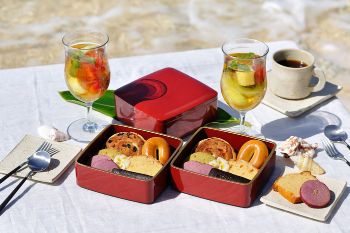 沖縄で親しまれてきたお菓子を、現代風にアレンジしたオリジナルスイーツを用意します。色とりどりのおかずをお重に詰めて食べる従来の浜下りの風習になぞらえ、5、6種類の焼き菓子をお重に詰めました。婚礼の際に使われていたお菓子を現代風の生地に変えてアレンジした花ぼうるや、きび糖と紅芋パウダーを使用した焼き菓子など、沖縄らしさを感じる個性豊かなオリジナルスイーツを、海を眺めながら味わえます。