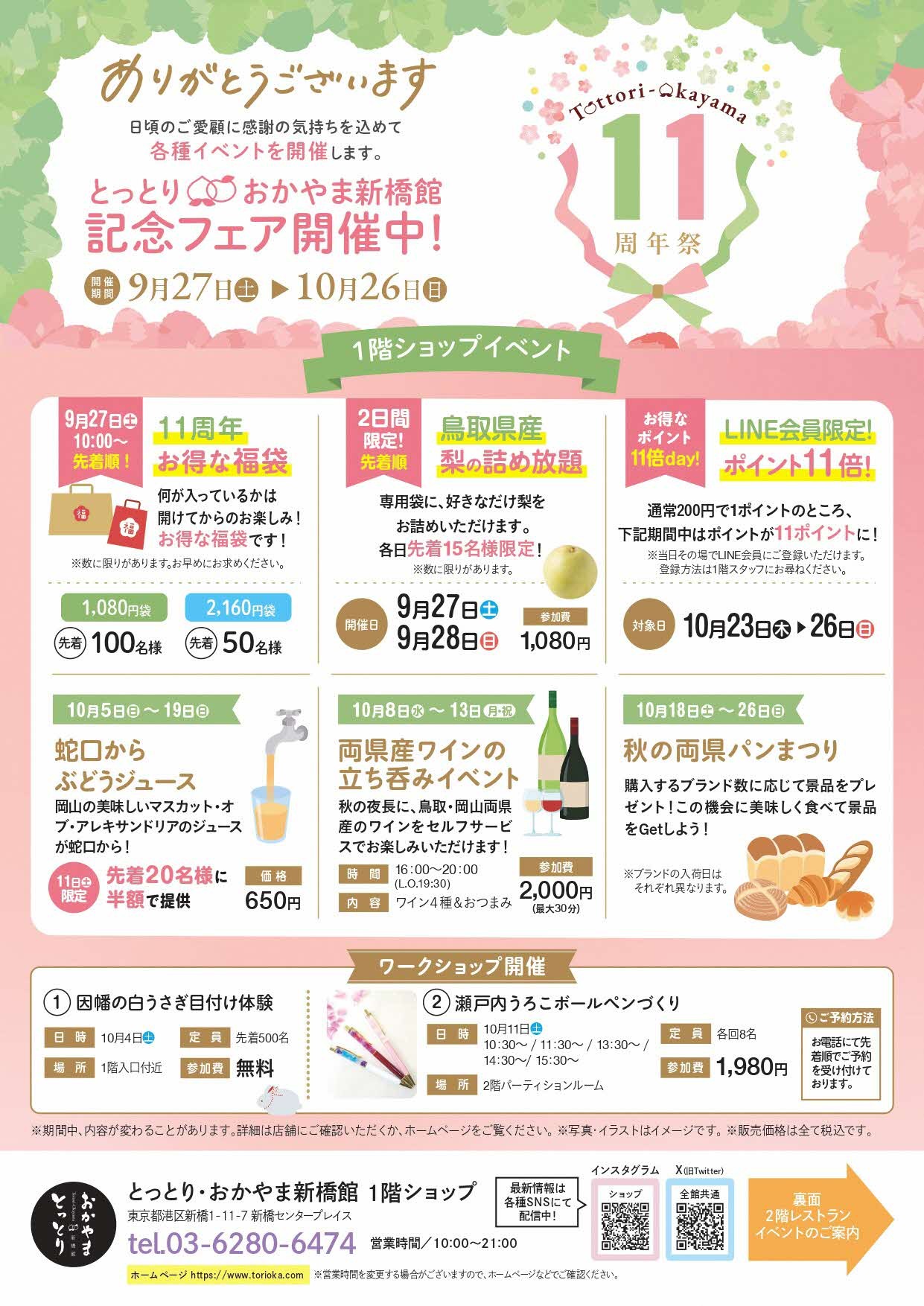 鳥取県と岡山県が共同で運営する首都圏アンテナショップ「とっとり・おかやま新橋館」は、令和7年9月28日(日)に開館11周年を迎えます。日頃のご愛顧に感謝の気持ちを込めて、鳥取県産梨の詰め放題など下記のとおり各種記念イベントを開催します。