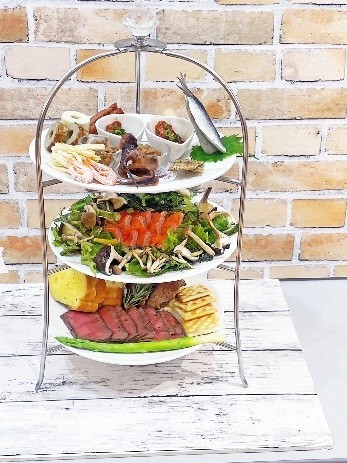 両県の海の幸、山の幸を三段料理に仕立て、お酒などとともにお客様同士でシェア可能です。