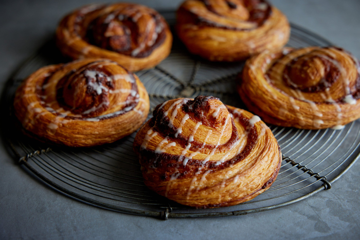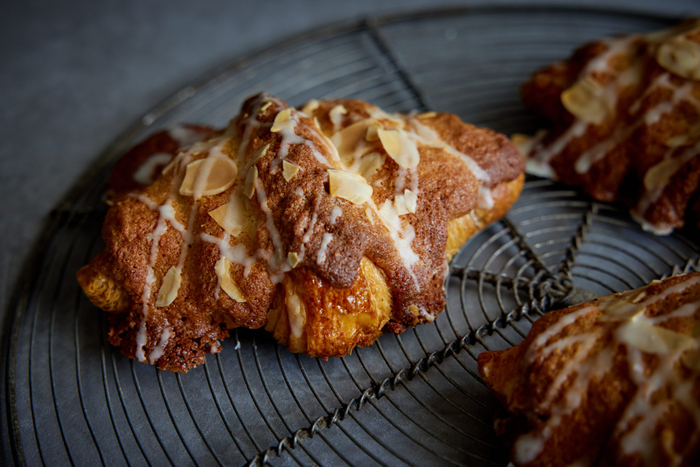 クロワッサン生地を使用し、クレームダマンド、カスタードクリーム、ヘーゼルナッツプラリネ、シナモンを巻き込んで焼き上げた、エシレ流のシナモンロールです。高さを出さず、自然に生地を広げることで最初の一口はサクッとした食感に。また、クロワッサン生地とクリームを バランスよくあわせることで、サクサクとした食感の中にしっとり感も広がり、異なる2つの食感をお楽しみいただけます。