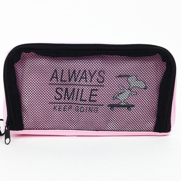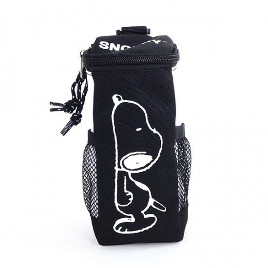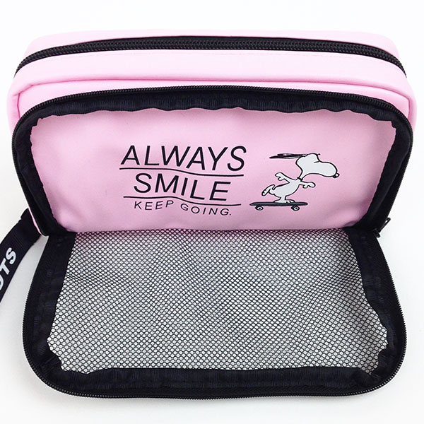珍しい縦型のラウンドペンポーチです。寝そべったスヌーピーのデザインがかわいいですね。両脇にはメッシュのポケットもついています。7.5×18.5×6.5cmで大満足の収納力。トップ部分にはカラビナなどもつけられて、バッグに取り付けることもできちゃいます。