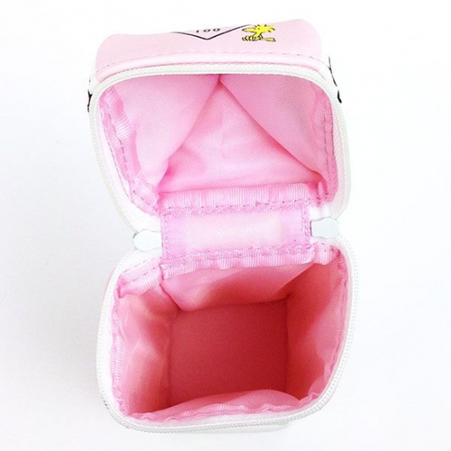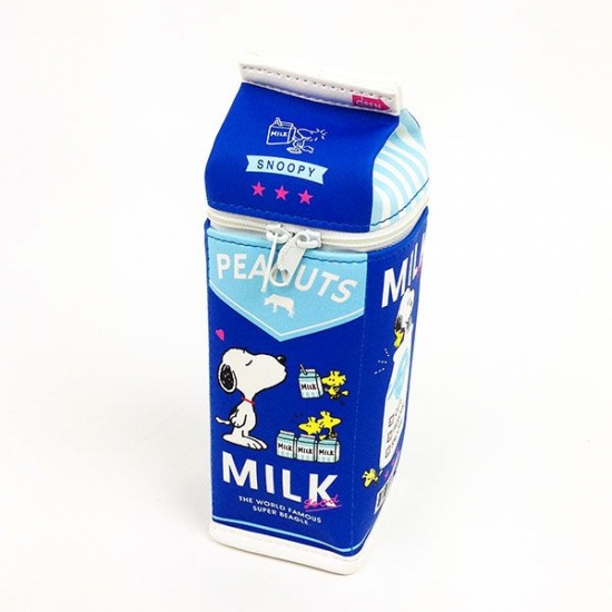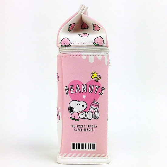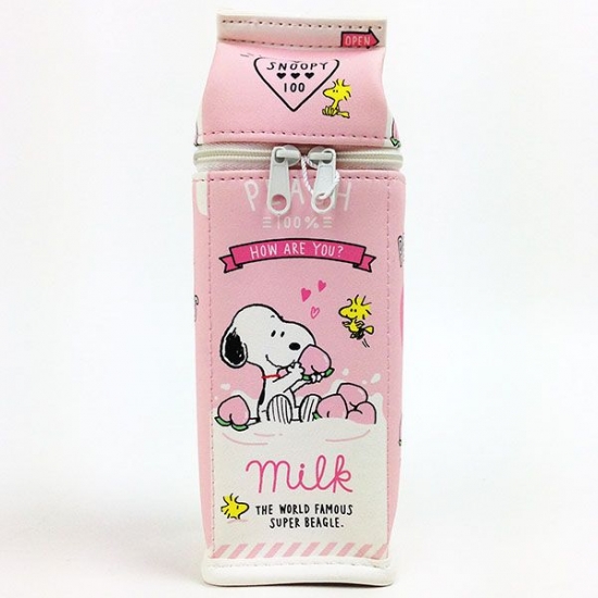 人と違う物を持ちたい人には、こちらもオススメ!牛乳パックフォルムのペンポーチです。ピンクのかわいいパッケージで、モモを持ったスヌーピーとウッドストックがいますね♡