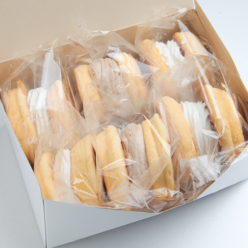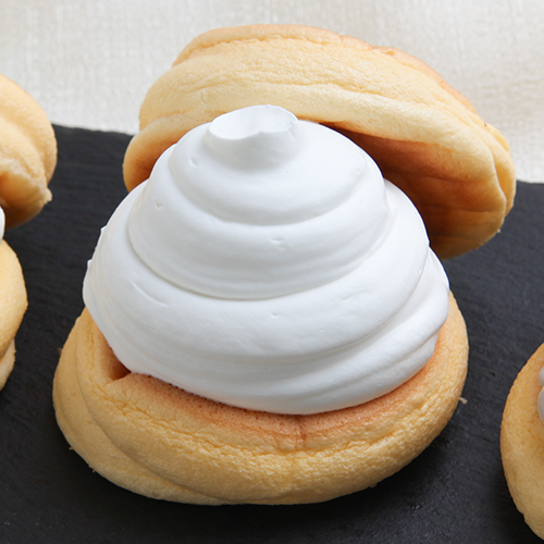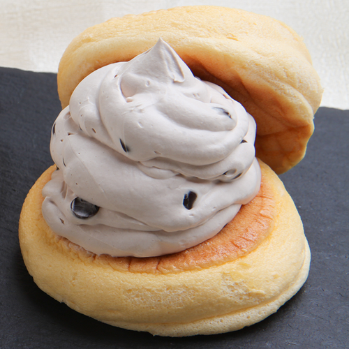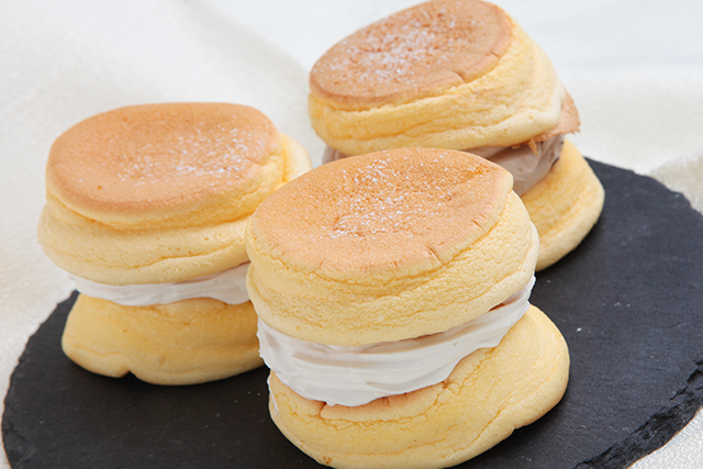 当店パティシエがメレンゲから1枚ずつ丁寧に焼き上げた「ふわふわのパンケーキ」と、3種類のお味が楽しめる生クリーム、解凍時間によって変わる食感をぜひお楽しみください。