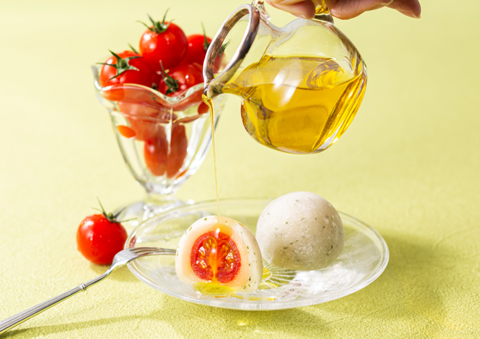 株式会社亀屋万年堂(本社・工場:神奈川県横浜市都筑区 / 総本店:東京自由が丘)は、神奈川県湘南エリアにある「井出トマト農園」で丹精込めて生産された、フルーツ感覚で食べられるオリジナル品種のトマト「ハニードロップ」を、甘さ控えめの白餡と、スイートバジルを練り込んだやわらかな羽二重餅で包んだ『完熟トマト大福』(1個162円(税込)・常温販売)を直販28店舗(東京・神奈川)にて販売しております。冷やしてクリームチーズを添えたり、オリーブオイルをかけても爽やかな香りがプラスされておいしくお召し上がりいただける『まるでイタリアン!?』な和菓子の登場です。